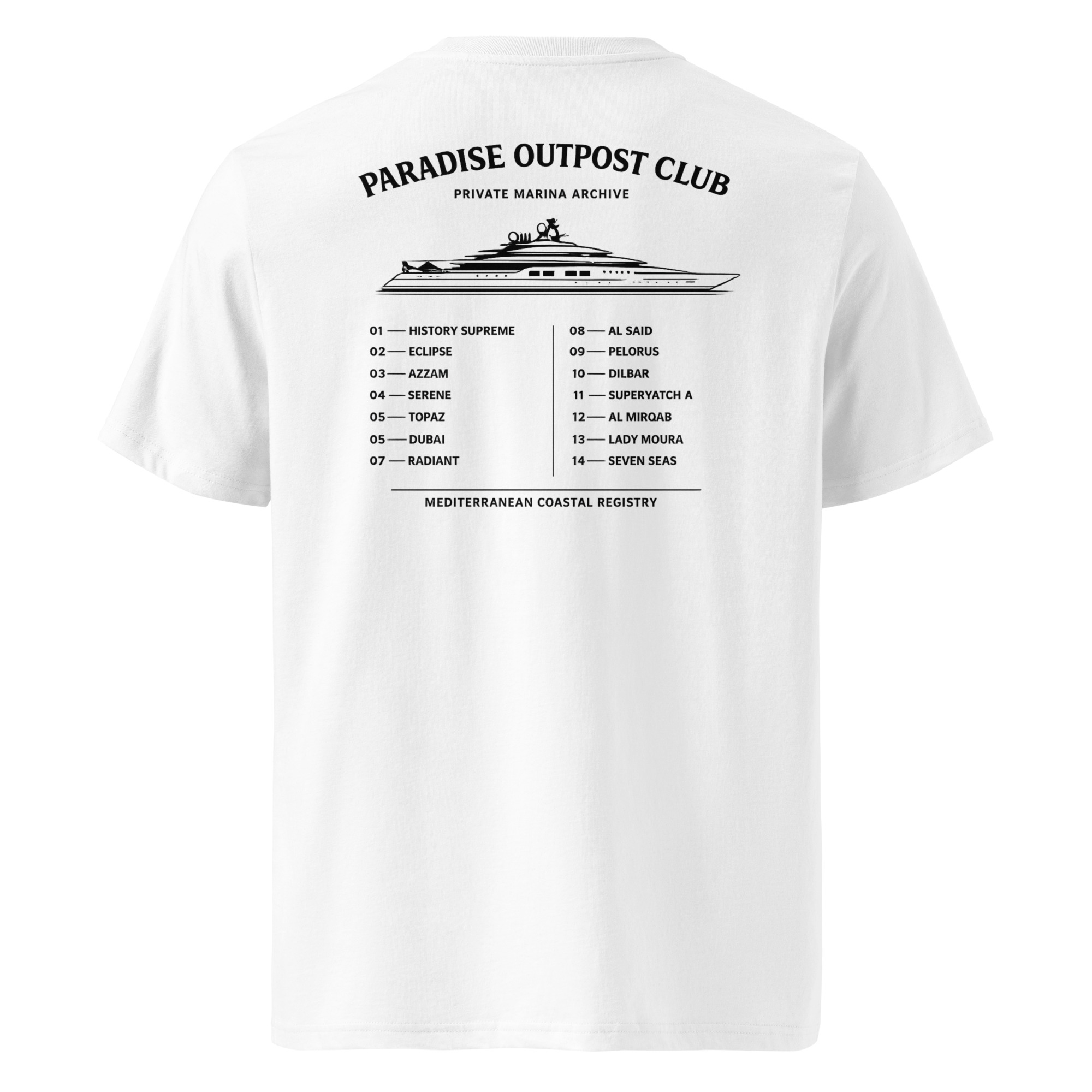La camiseta Private Marina Archive de Paradise Outpost Club está inspirada en la estética de los clubes náuticos y los registros de marina privados.